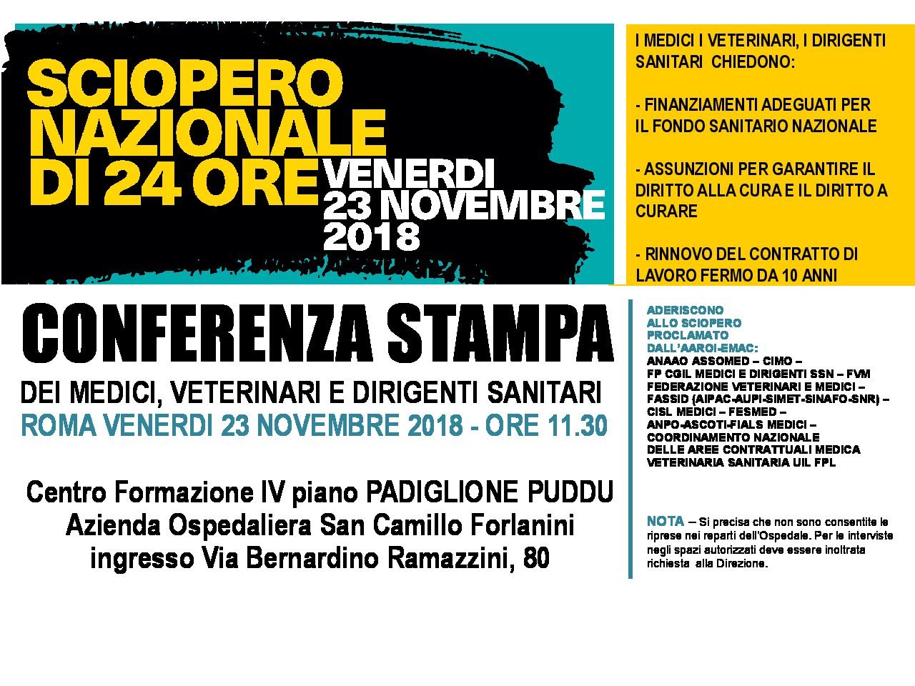 DettagliI MEDICI I VETERINARI, I DIRIGENTI SANITARI CHIEDONO: – FINANZIAMENTI ADEGUATI PER IL FONDO SANITARIO NAZIONALE – ASSUNZIONI PER GARANTIRE IL DIRITTO ALLA CURA E IL DIRITTO A CURARE – RINNOVO DEL CONTRATTO DI LAVORO FERMO DA 10 ANNI banner conferenza stampa (1)